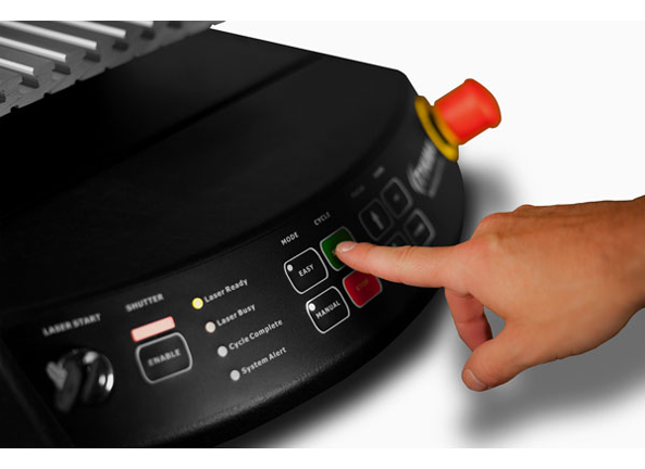 Our Easy Mode™ system provides maximum efficiency to your marking operation. Simply load the part, press start and the entire marking process is automated. A three-sided automatic vertical door provides an ergonomic method for part loading. A powered part-loading table with our focus finder system makes focal adjustment easy. Machine management is simple with the front mounted operator control panel.